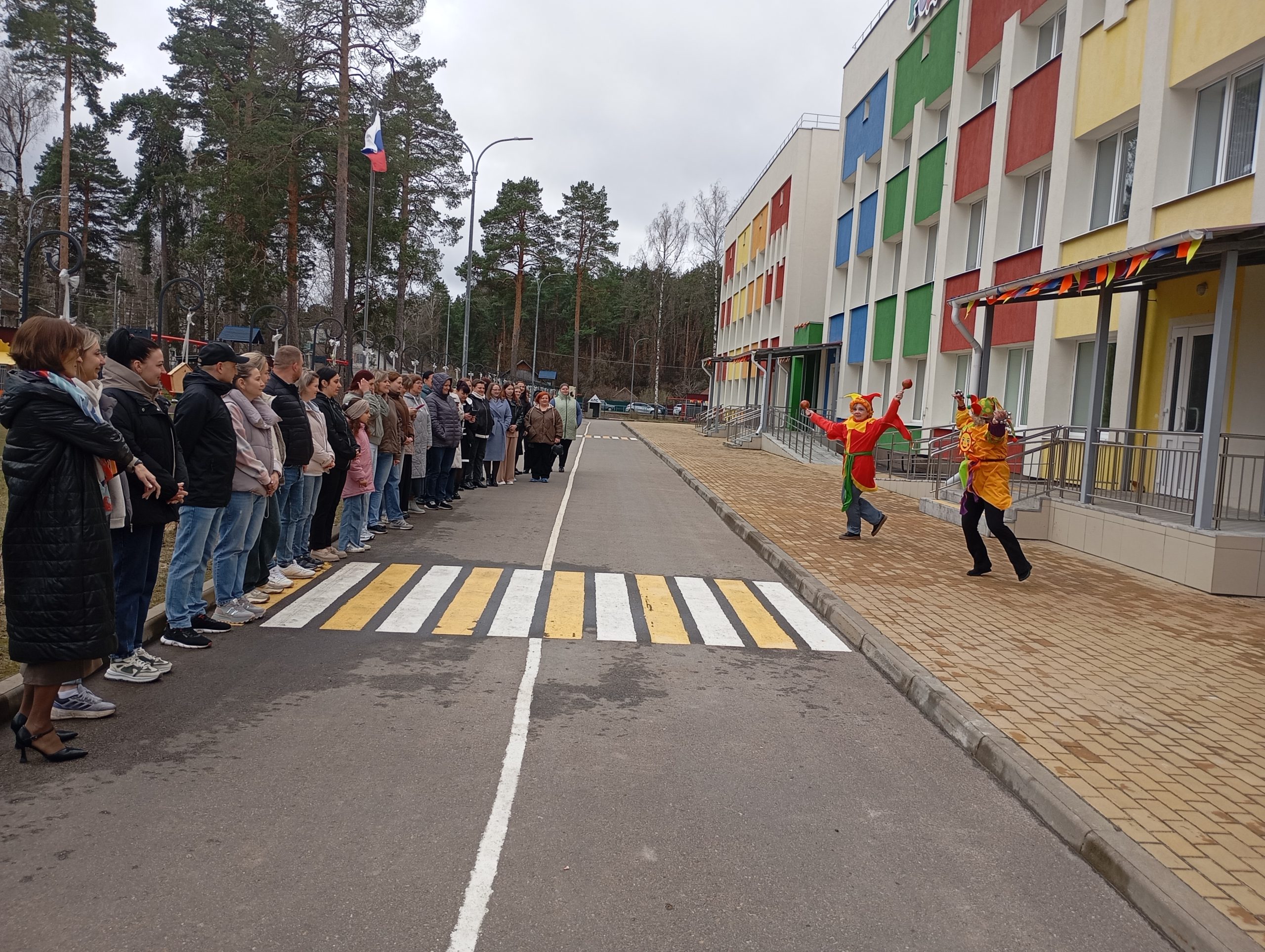 Праздник начался с тёплой встречи: гостей приветствовали скоморохи в лице педагогов и воспитанники, исполнившие танец «Балалаечка».
