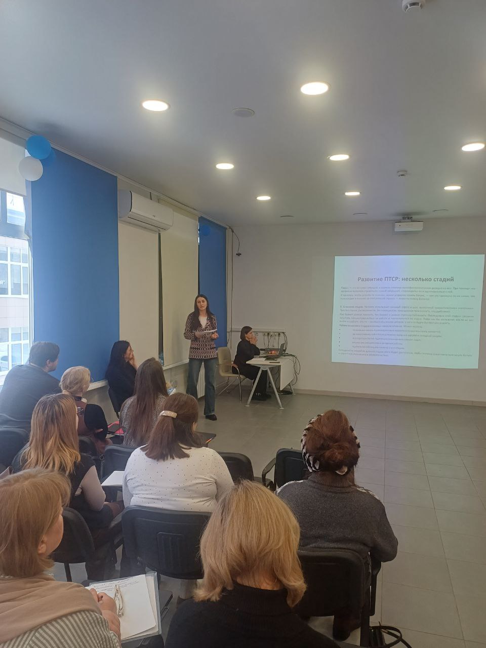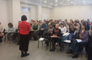 Золотая Я.А., педагог-психолог детского сада №162 г. Брянска, раскрыла тему «Жизнь с травмой наблюдателя или косвенные жертвы боевых действий». Она рассказала участникам семинара о «психотравме свидетеля», человека, наблюдающего, как происходят тяжелые события, привела показательные примеры поведения «наблюдателей», как взрослых людей, так и детей различных возрастов, реагирующих на психотравму. Отдельный фрагмент выступления был посвящен разбору типов и признаков ПТС и анализу специфики работы психолога при оказании помощи на каждой стадии. В выступлении была затронута тема влияния травмы на отношения со значимыми людьми, даны соответствующие рекомендации по работе с конфликтами, вызванными ПТСР. В заключение Золотая Я.А. остановилась на рассмотрении факторов, усугубляющих травму и использовании психотехник, помогающих клиентам. Отдельные упражнения («5-4-3-2-1») были выполнены участниками семинара после получения соответствующей инструкции.